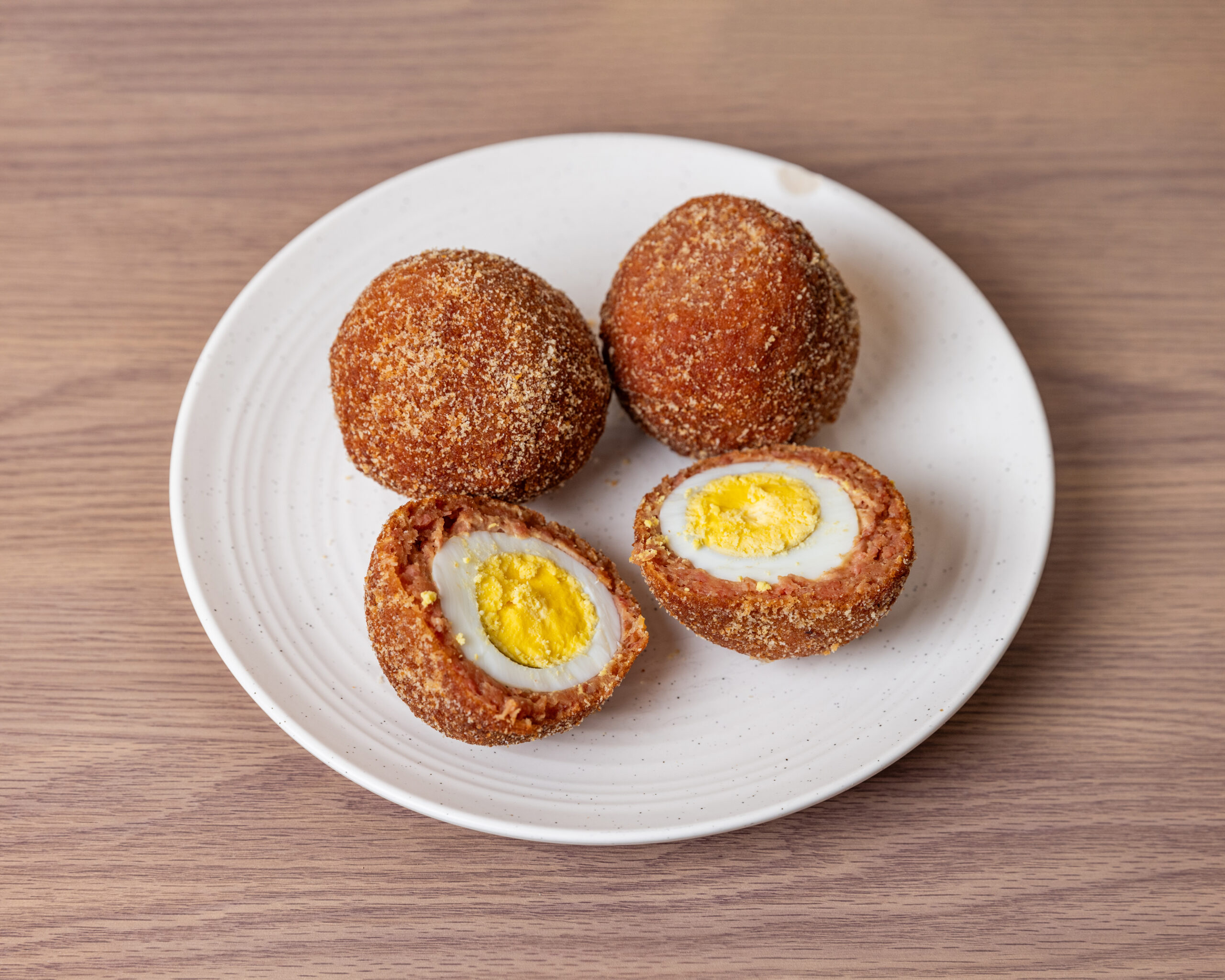 Each one is made with perfectly boiled eggs wrapped in our signature beef sausage meat and coated in crunchy breadcrumbs